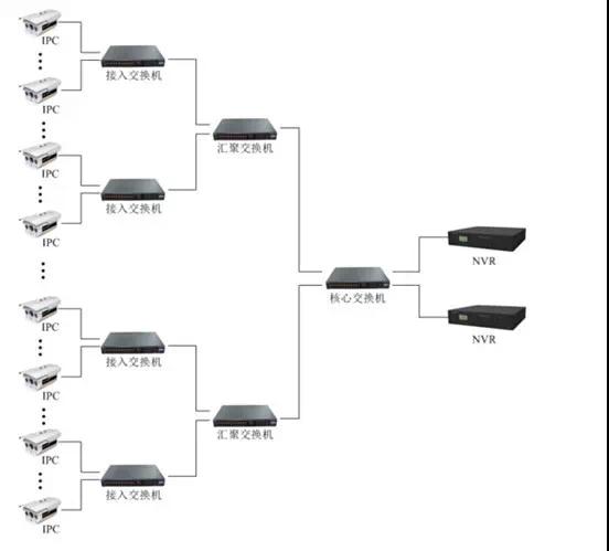 對于100個點位的組網,一般只有核心交換機與接入層交換機,沒有用到匯聚層交換機。
